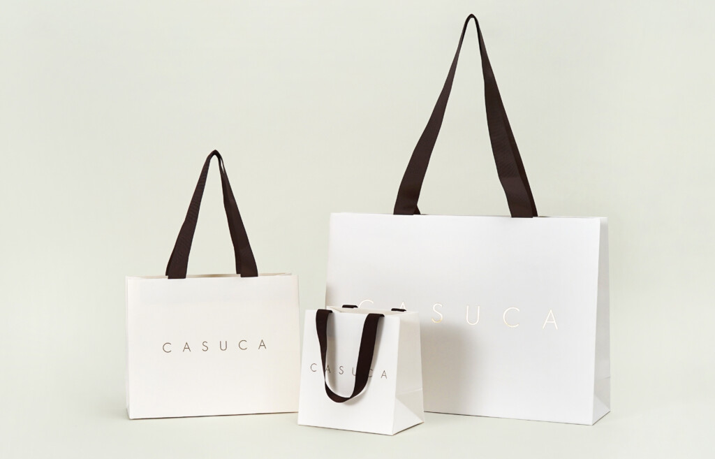 今回ご依頼いただいたショッパーは、表面がざらっとした紙を選んでいただき、その上に箔押しを採用されています。つるつるした素材ではない点に、CASUCA HISTORIA様のジャギー感、ラフ感というイメージが合っているように感じます。今後私どもベリービーがお手伝いさせていただけることがあれば、ぜひお聞かせください。