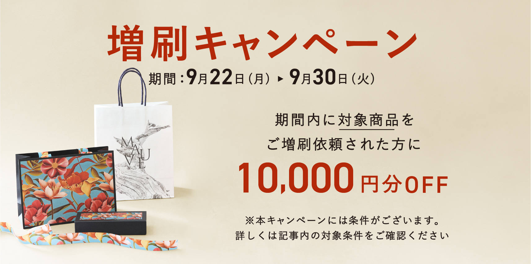 ・対象期間:9月22日(月)〜9月30日(火)ご発注分まで ・対象商品:下記オリジナル紙袋商品 ・キャンペーン内容:既製データを利用した追加印刷を、通常価格より10,000円OFFにてご提供 ・対象条件1. 10万円以上(税別)お買い上げの方。 ・対象条件2. 過去にご発注いただいた商品と同じ加工、同じデザインの場合。