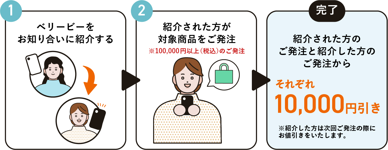 ![]() 期間中に、「紹介された方(新規注文のお客様)」が、ベリービーで税込100,000円以上ご発注いただくと、紹介した方・紹介された方双方に10,000円のお値引きをプレゼントいたします。 ○詳細