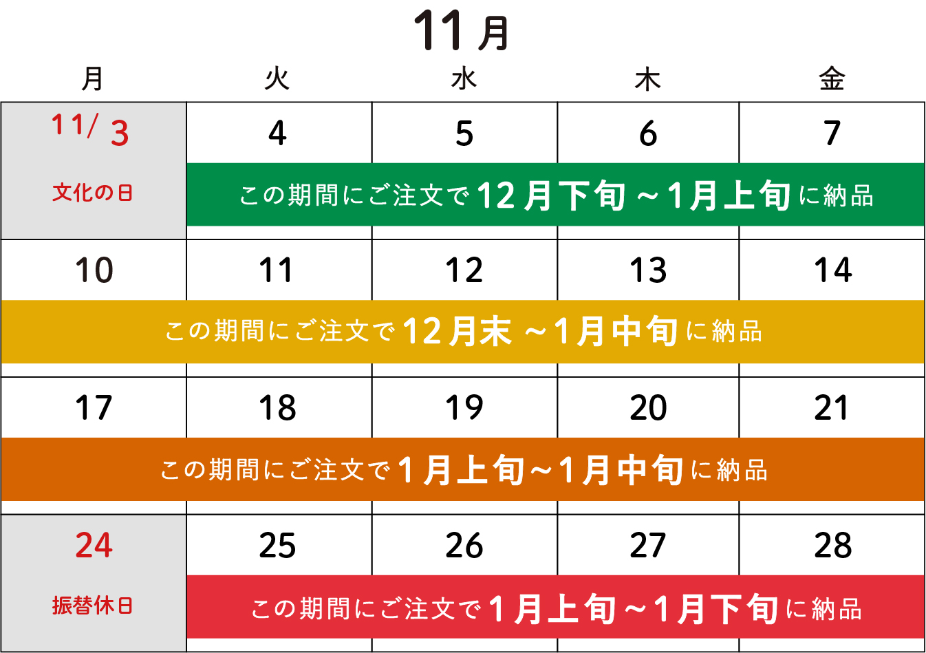 カレンダーに記載の納品スケジュールは、 納品までに45日以上いただく商品が対象です。 商品ごとに納期は異なりますので、詳細や納品日のご希望がある場合はお気軽にご相談ください。また、年末年始を挟む時期は製造・運送ともに混み合いやすくなります。 バレンタインデーまでの納品をご希望の場合は、 11月下旬までのご発注がおすすめです。 カレンダーで納品時期をチェック