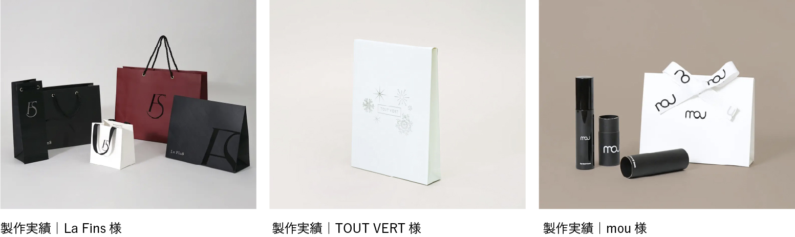 エンボス加工やUV印刷での表現、口留め部分へのリボンや両面テープの取り付けなど、細部までブランドらしさを演出できるオプションを多数ご用意。 紙袋と合わせてブランド力アップ