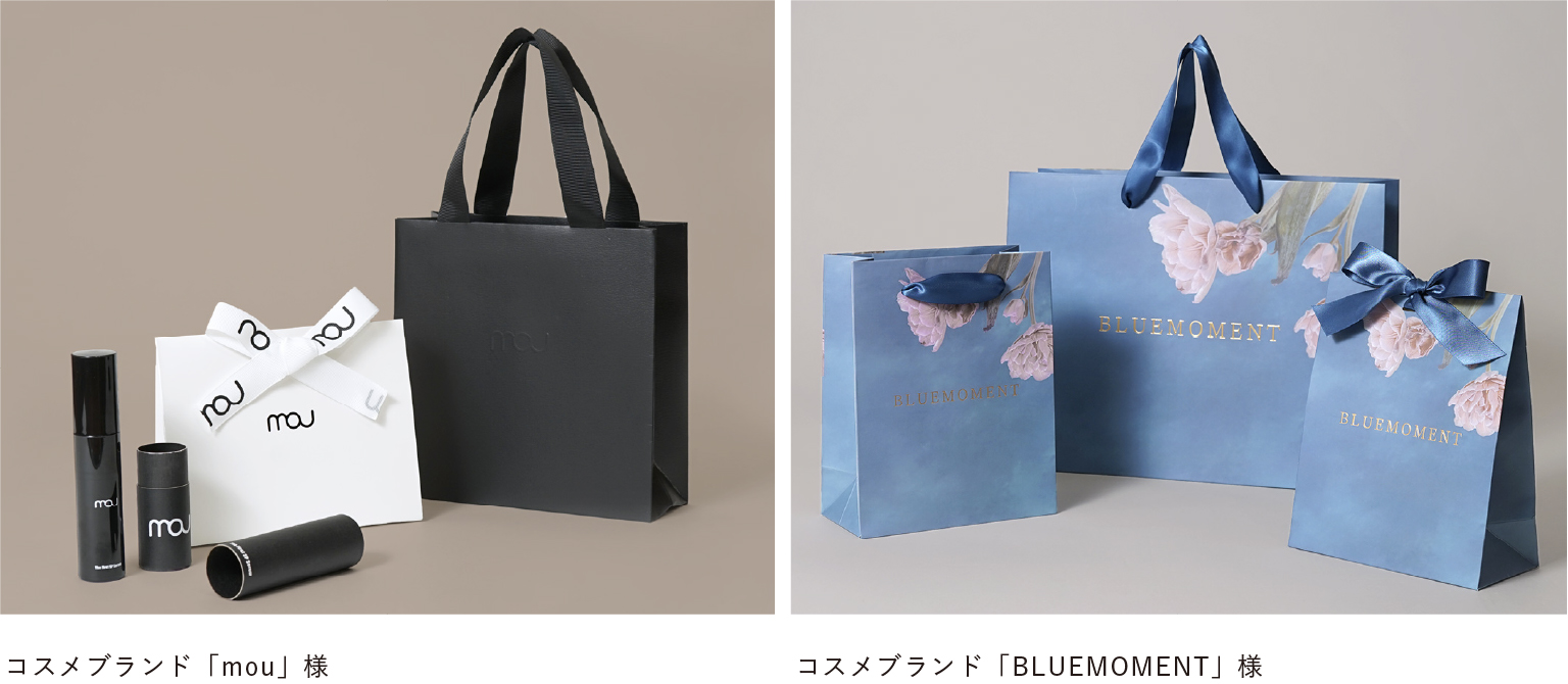 画像左側のコスメブランド「mou」様のようにプレゼントバッグだけデザインを変えることで全体の印象を引き締めたり、右側の「BLUEMOMENT」様のように、パッケージ全体に統一感を持たせることで、ブランドの世界観や印象をより強く伝えることができます。 ベリービーでは、サイズ・仕様・素材・印刷まで自由にお選びいただけるため、ブランドイメージに合わせたパッケージづくりが可能。パッケージに関することならどんなことでもご相談いただけますので、ブランドづくりや世界観の表現にもぜひご活用ください。 商品詳細はこちら オリジナル紙袋・パッケージの提案、相談をご希望の方は東京・大阪のショールームへぜひお越しください!