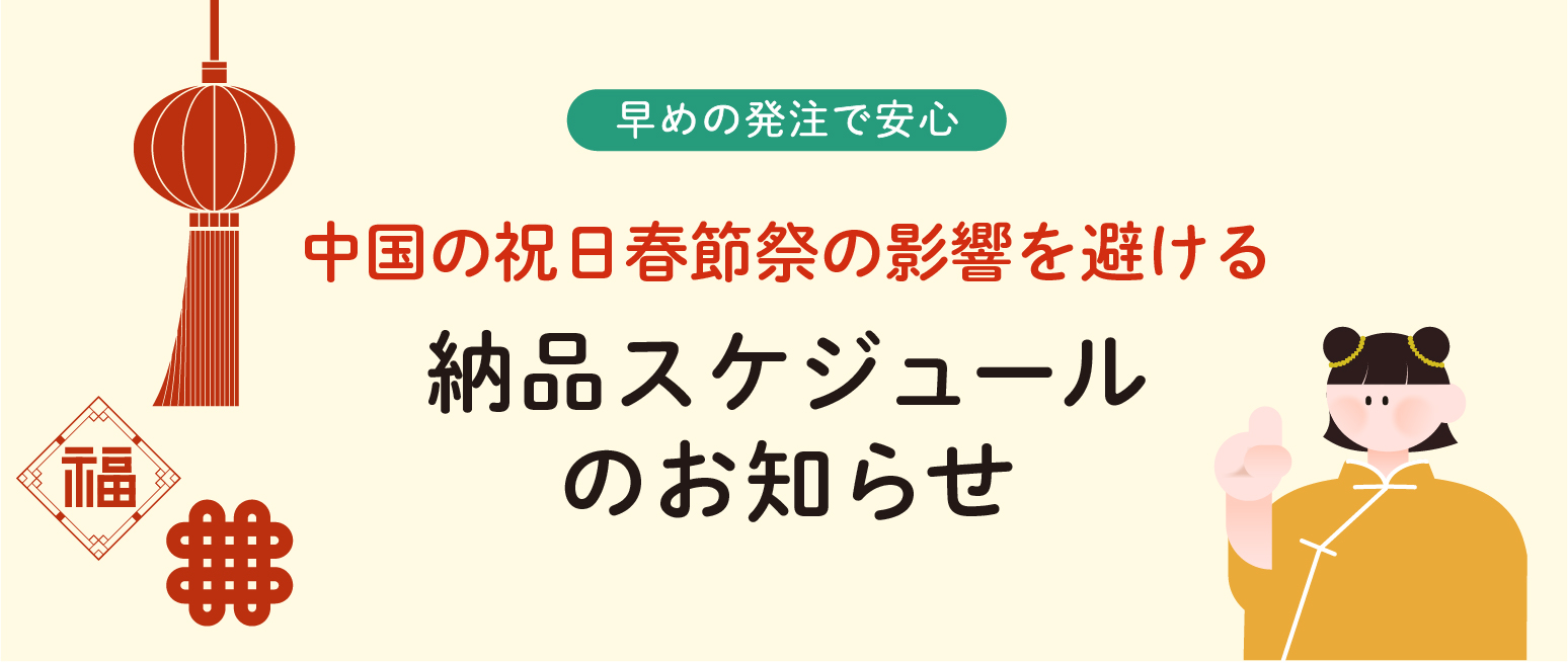 春節祭の間は中国全体が大型連休となるため、製造期間に大きく影響します。 お問い合わせ 対象商品とご発注時期について