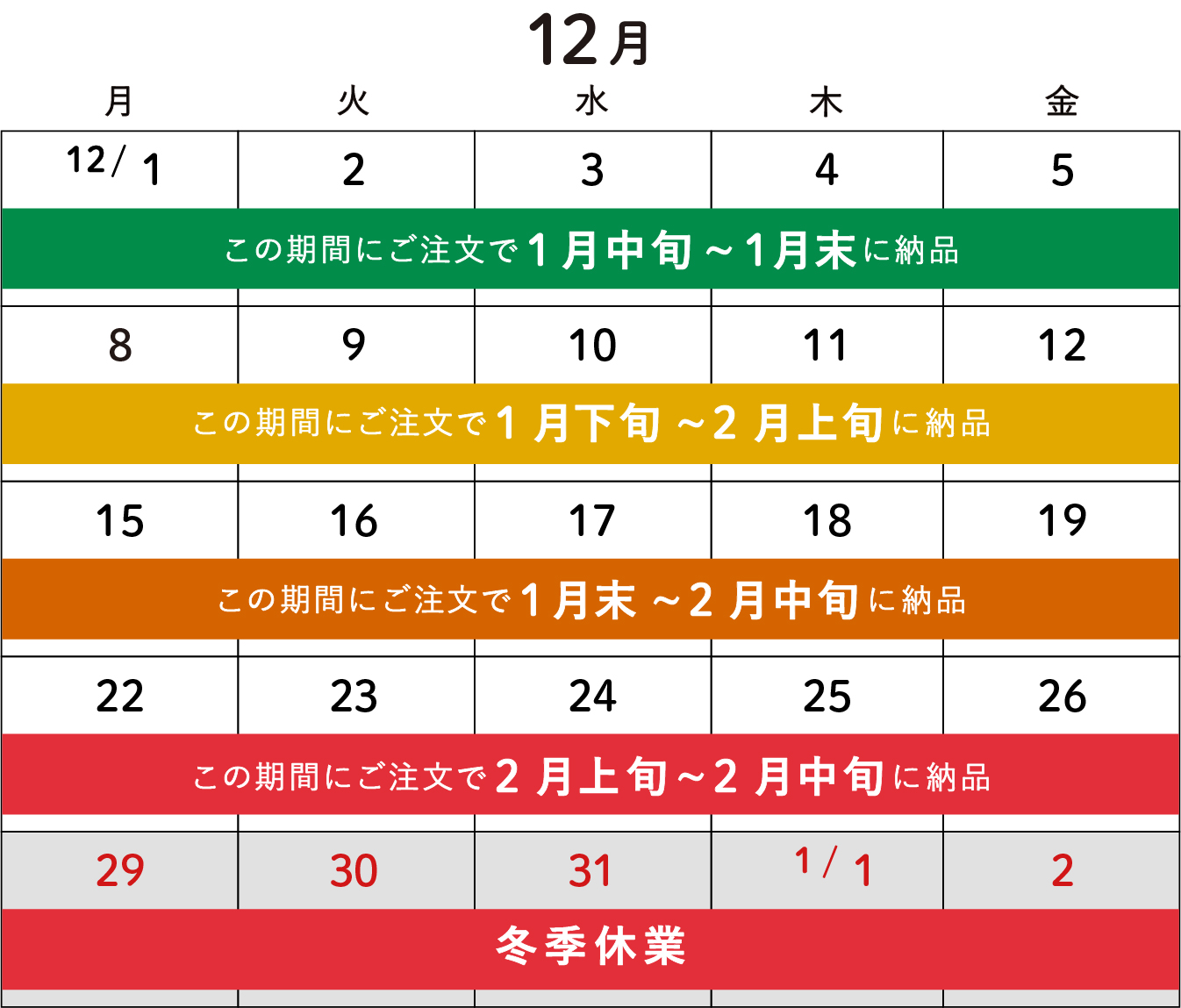 発注時期ごとの納品スケジュールをカレンダーにまとめていますので、ご希望の時期に合わせて早めのご発注をご検討ください。春節祭に影響されず納品をご希望の方は、 12月20日(金)頃までのご発注 をおすすめいたします。 ※12月26日が年内最終営業日となります。 カレンダーで納品時期をチェック