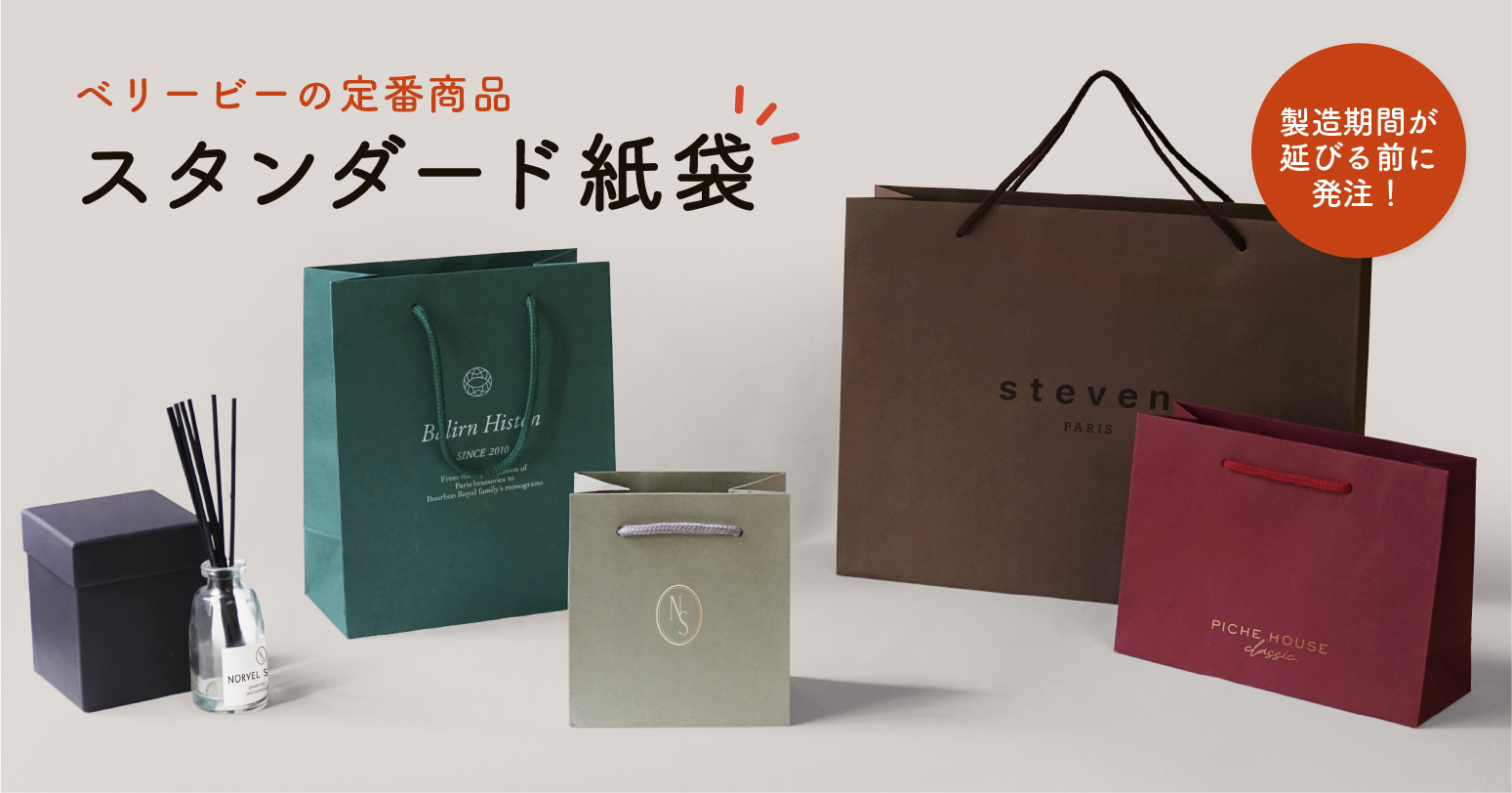 いつもベリービーをご利用いただきありがとうございます。デザイン・マーケティング部の大野です。 納期についてのご案内はこちら 「スタンダード紙袋」について