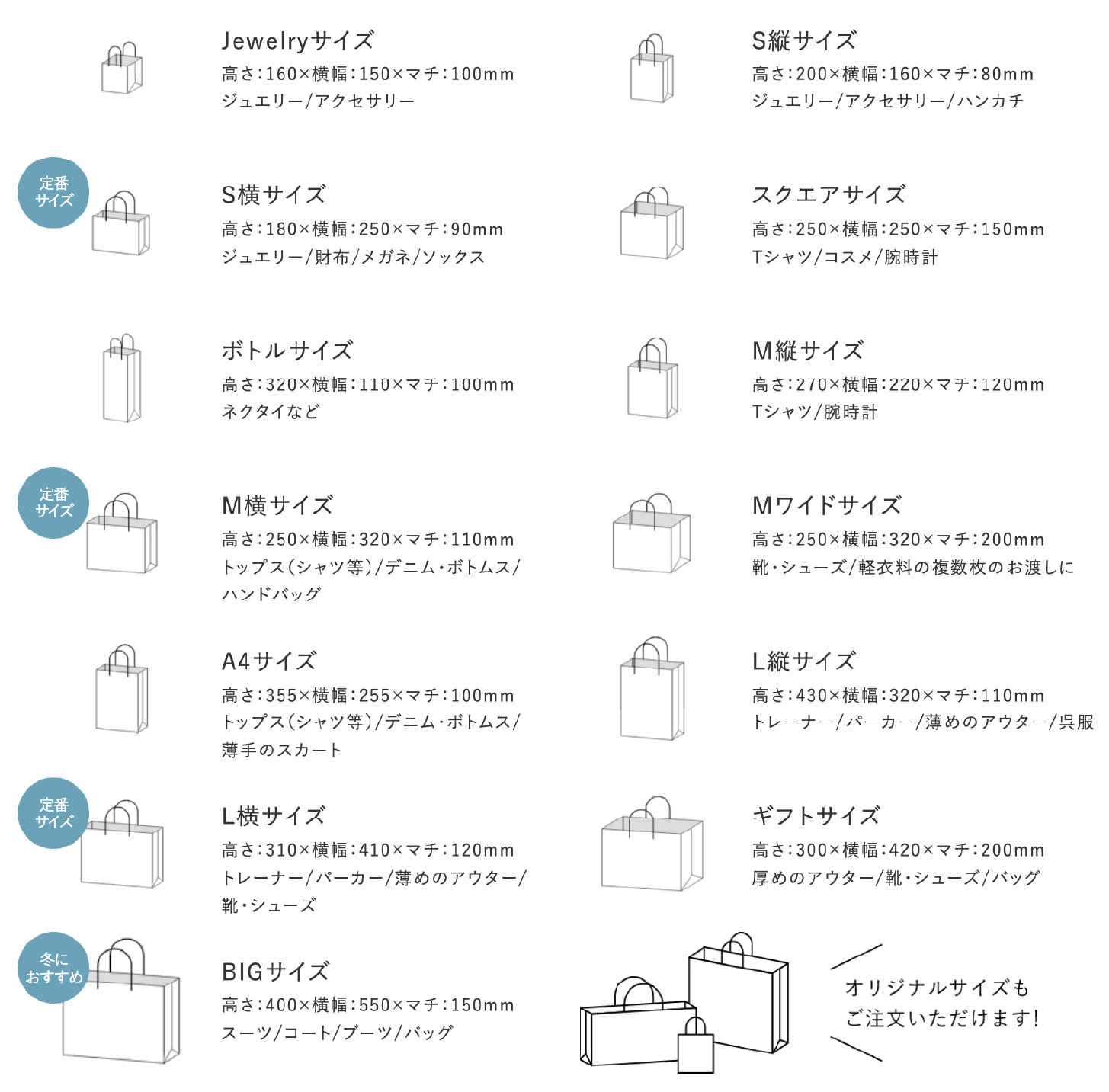 13サイズをご用意しています。内容物のサイズが決まっていない場合でも、各サイズごとに紙袋に収まる内容物の例をご案内していますので、そちらを参考にしながらご検討いただけます。 商品詳細を見る 初めての紙袋づくりから、定番として長く使えるスタンダード紙袋