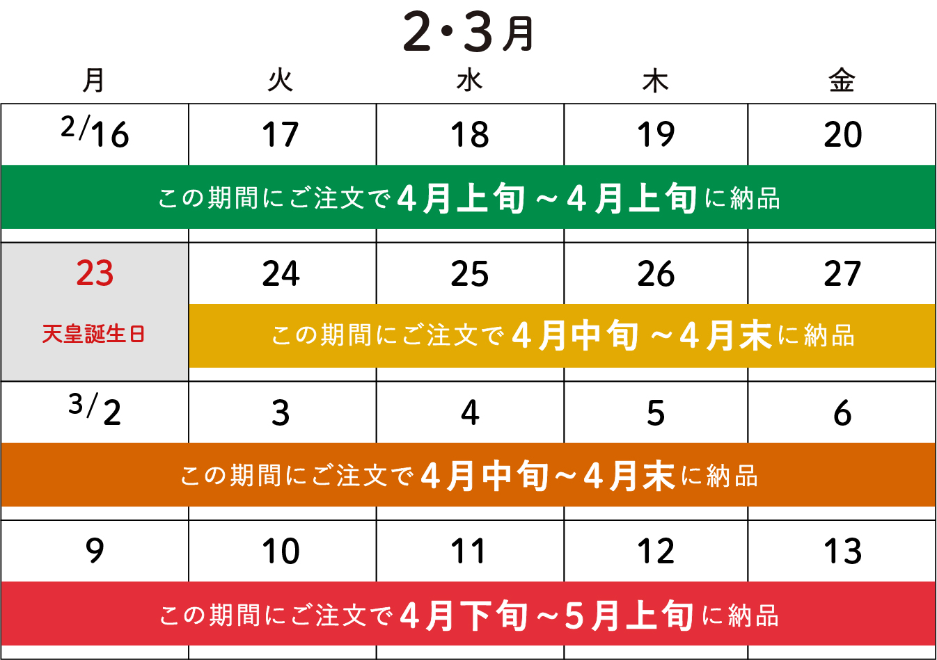 ※商品や仕様によっては輸送機関の混雑・資材の入荷に遅れが生じる場合がございます。