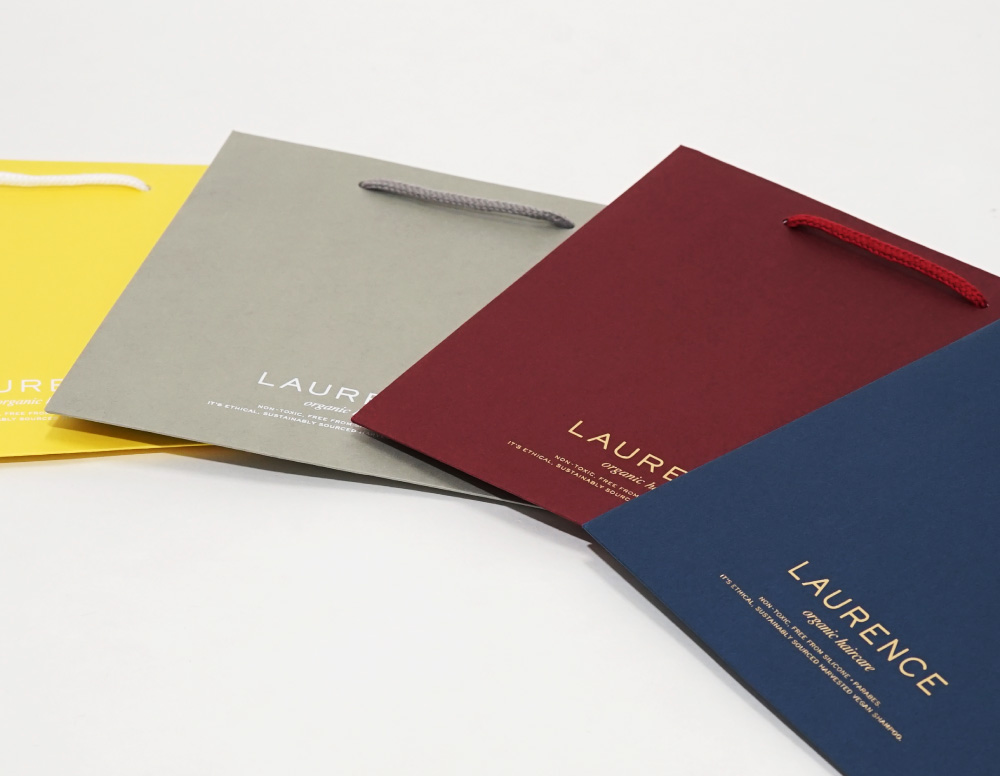 高級ヘアケア用品のブランドで使われる紙袋、という設定で作られた紙袋サンプルが「LAURENCE」です。