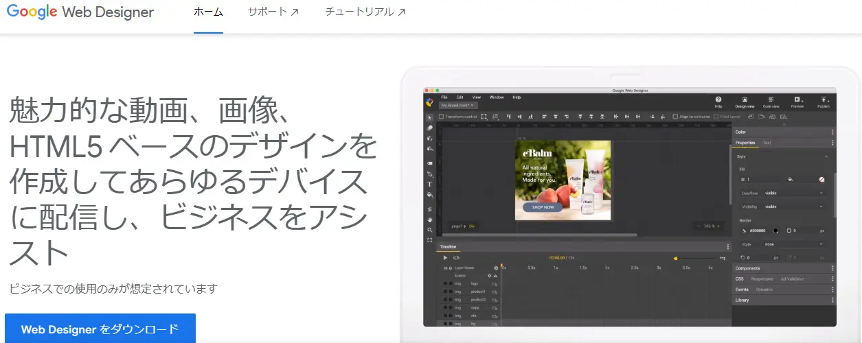 Google Web Designerは、主にインタラクティブなWebデザインを作成するためのツールです。アニメーションやインタラクションを取り入れた大人っぽいWebデザインを作成したい場合に最適です。Googleのツールだけあって、使いやすく、クラウドベースでどこからでもアクセスできます。