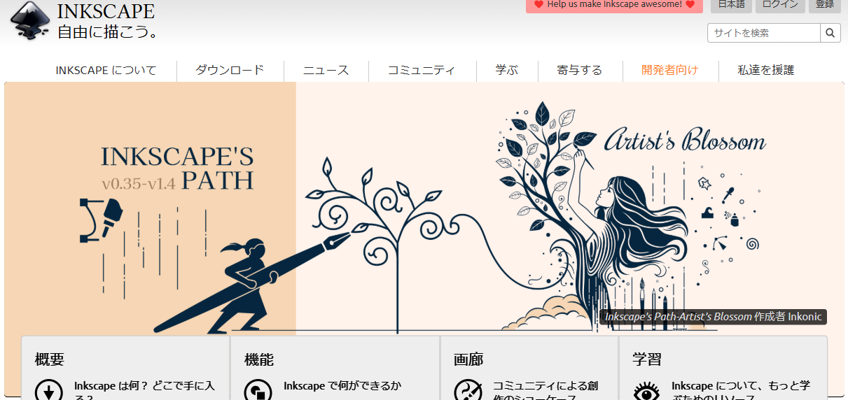 Inkscapeは、無料で使用できるベクターグラフィックソフトです。Illustratorに似た機能を持ちながらも、初心者にも親しみやすいインターフェースを備えています。複雑なデザインを作成する際に便利で、大人っぽいエレガントなデザインを作成するのに最適です。