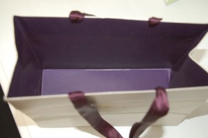 すごくお気に入りの紙袋2011年10月18日 こんにちはベリービーの芦谷です。 今日は私がとても気に入っているデザインの紙袋をご紹介します。 とってもシンプルなデザインですが 大人の魅力を感じさせます。 全体的に落ち着いたグレー。その中に少し深い目のグレー箔押しがいいですね。 グレーに合わせた深い紫色のリボンとのコントラストも絶妙。 口折りを表側にしている所なんかもキュートです。 内側にはリボンに合わせた深い紫色が底ボールまで印刷されています。 この紙袋は私の宝物の一つです。