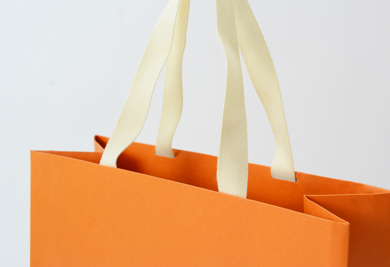 使っている色はブランドカラーのオレンジと、ロゴ・ハンドルの生成り色とシンプルな色構成の紙袋です。