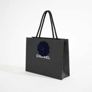 紙質・ベロア・マットなブラックボディ、白色のロゴと大人の高級感を漂わせた紙袋となっています。