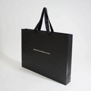 黒色のマットな質感の紙袋にホワイト箔でロゴが印刷されています。