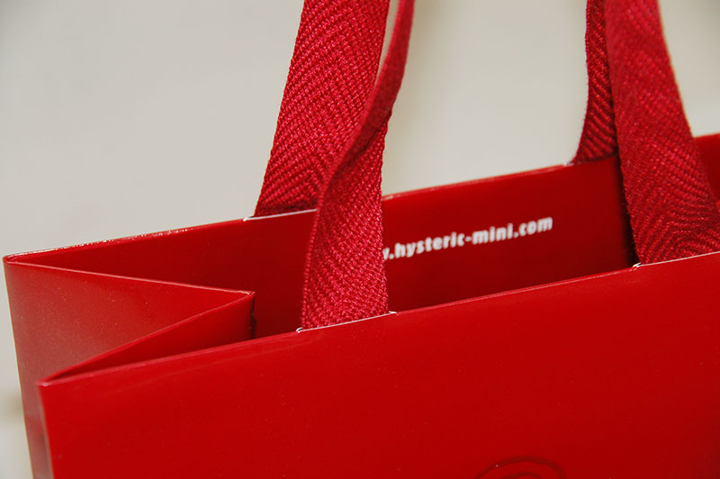 真っ赤がキュートでかっこいい紙袋2012年11月01日 こんにちはベリービーの芦谷です。 今日はフェラーリのような赤が素敵な紙袋をご紹介します。 紙袋のベースもハンドルも真っ赤です!! 赤の中に彩度の違う赤でイラストを入れて、 ロゴマークは赤によく似合ったシルバー箔押しです。 紙袋の表面には布目調のエンボスが施されているので質感があります。 赤い平紐は縦穴で取り付けられたいるのでスッキリです。 口折りにはURLがプリントされています。 内側には外の赤と対照的にモノトーンでキュートなイラストがプリントされています。