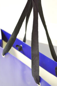 オリジナルのハトメを使った紙袋2013年10月07日 こんにちは! ベリービーの加茂です この紙袋は革製品を扱うファッションブランドの紙袋ですが、 サイズが大きめなのでバッグ用でしょうか? 全面を紺色に印刷し、ロゴを白ヌキにしたシンプルなデザインです。 紙はハイブランドなんかにも使用される厚めの紙で、 ジャガードエンボスが施されています。 厚めの紙ということもあって重量感がありますね。 紐はアクリル平紐を使用しています。 そして大きなハトメにはブランド名が入っています。 女性向けのブランドとは思えない程にたくましい紙袋です!