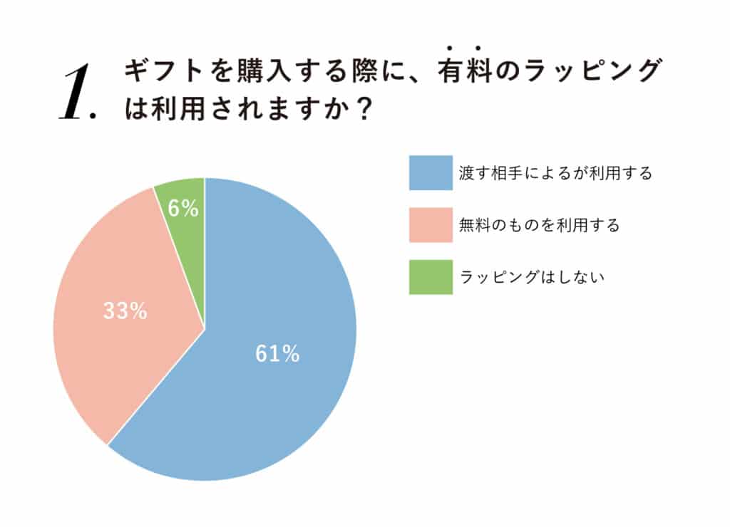 61%の方が「渡す相手によるが利用する」。続いて33%の方が「無料のものを利用する」を選択。そして6%の方が「ラッピングはしない」を選択する結果となりました。