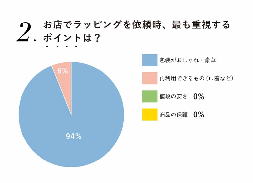 「包装がおしゃれ・豪華」を選んだ方がなんと94%。「再利用できるもの」を選んだ方が残りの6%。そして「値段の安さ」「商品の保護」を選んだ方は同時に0でした。